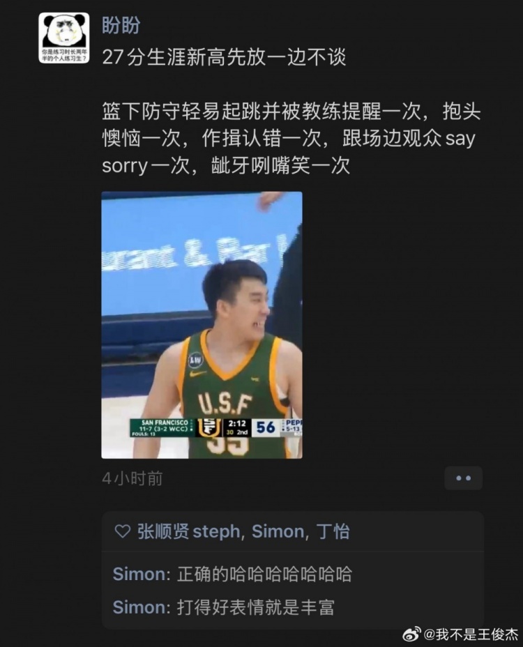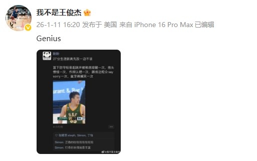 重回首发砍新高27分!王俊杰转发调侃自己的言论并配文:天才